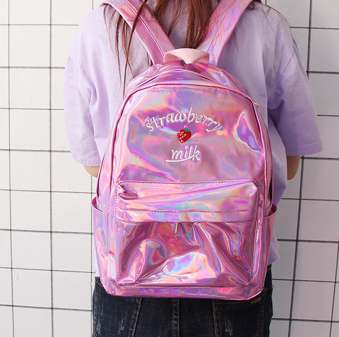 The Harajuku strawberry milk embroidery hologram holographic backpack is perfect for school, work, shopping, daily life and party ect.