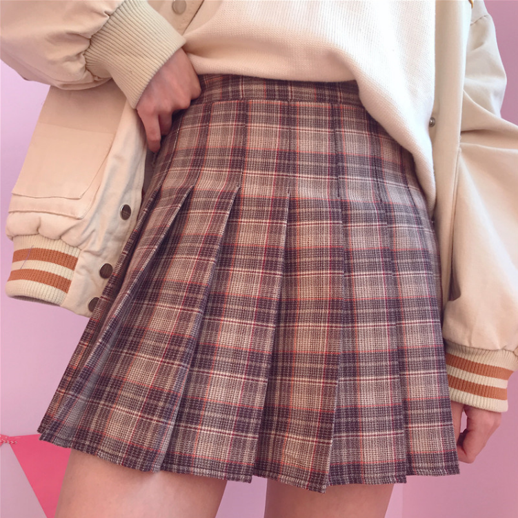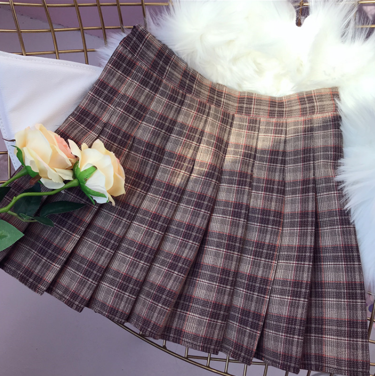 Free Shipping High Waist Coffee Khaki Color Block Plaid Pleated Skirt