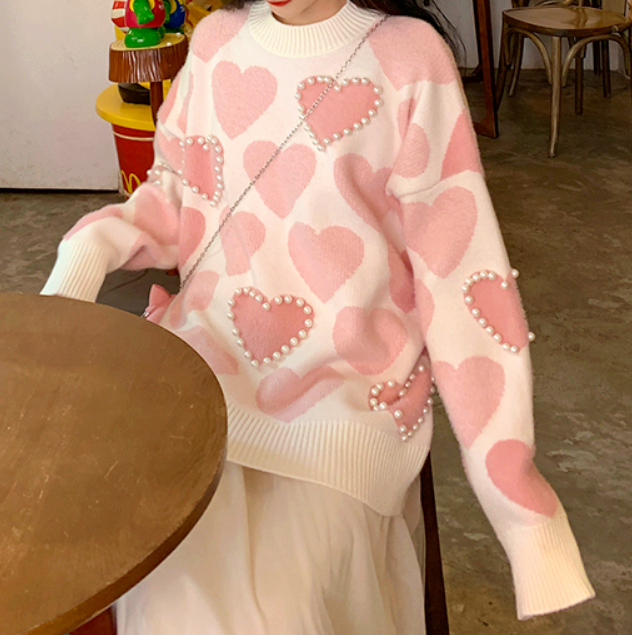 Chic & Soft love heart pearl bead knit sweater.