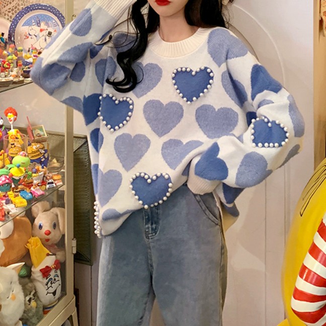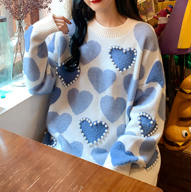 Chic Love Heart Pearl Bead Knit Sweater
