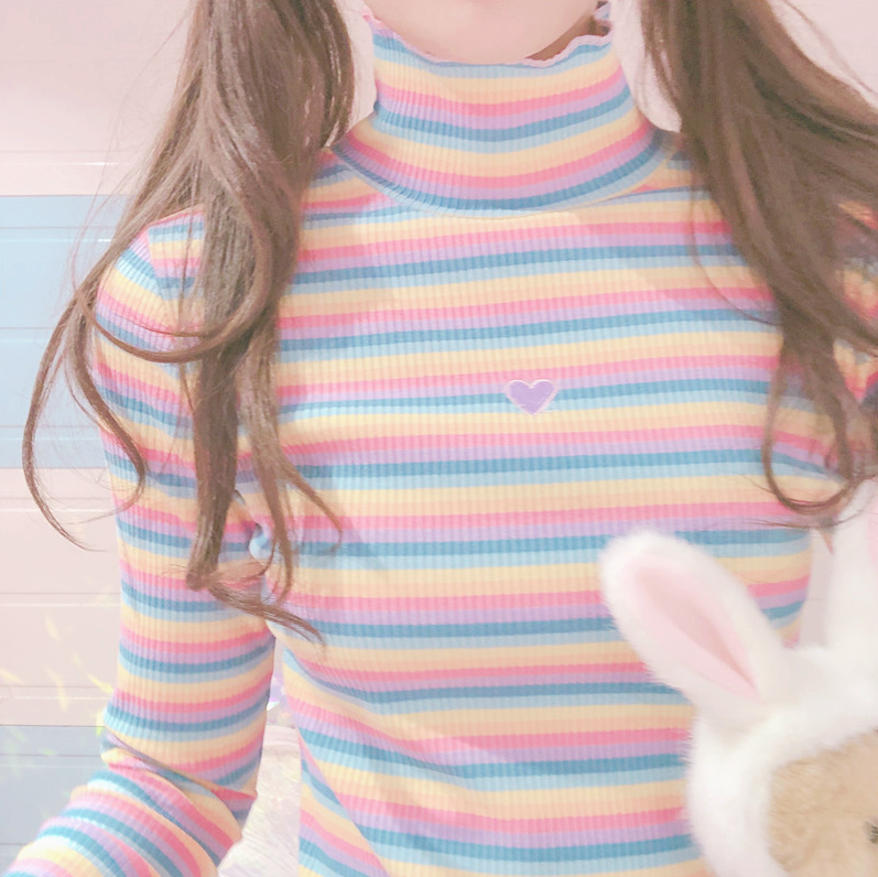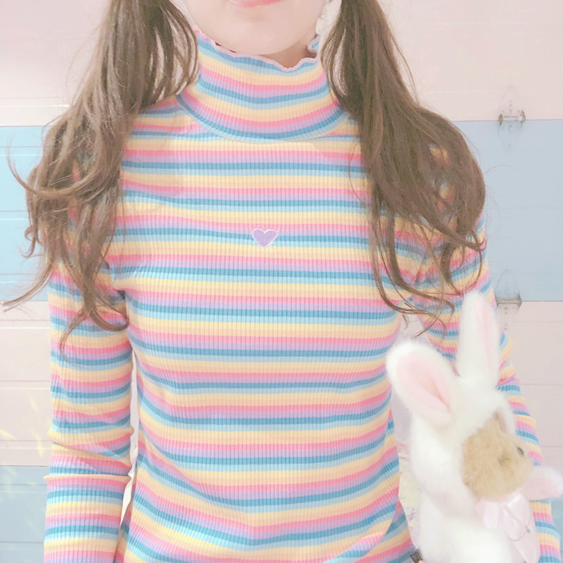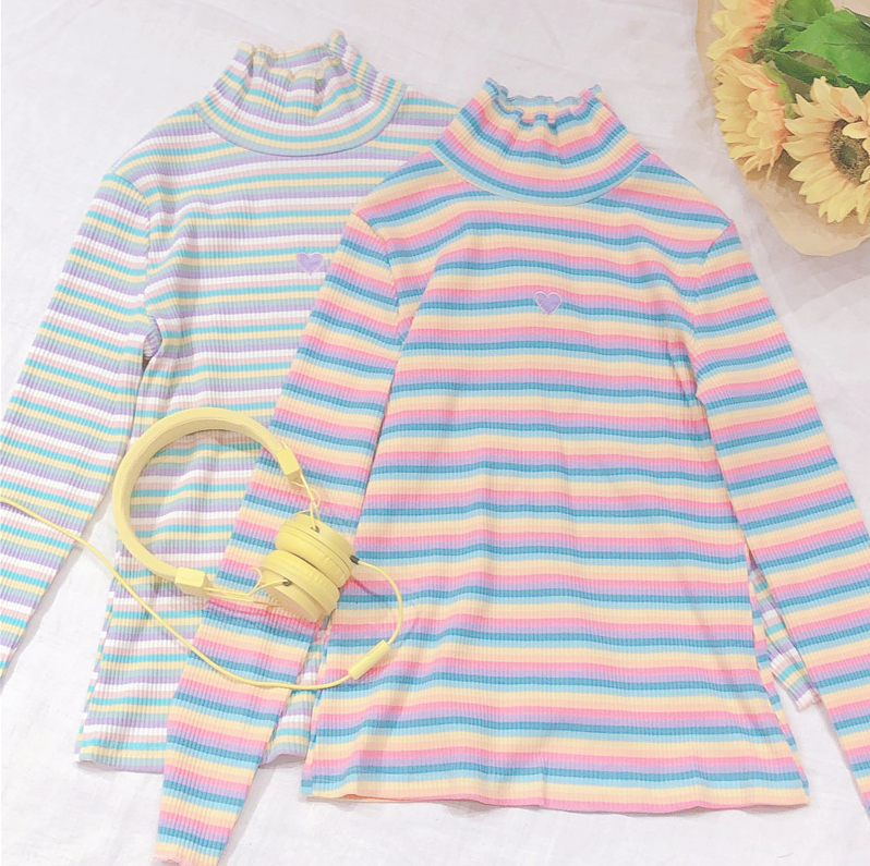 Fashion & Harajuku love heart embroidery high collar stripe color block T-shirt.