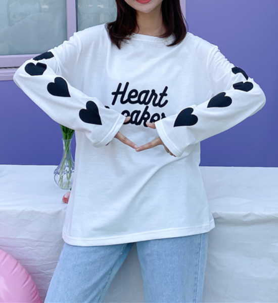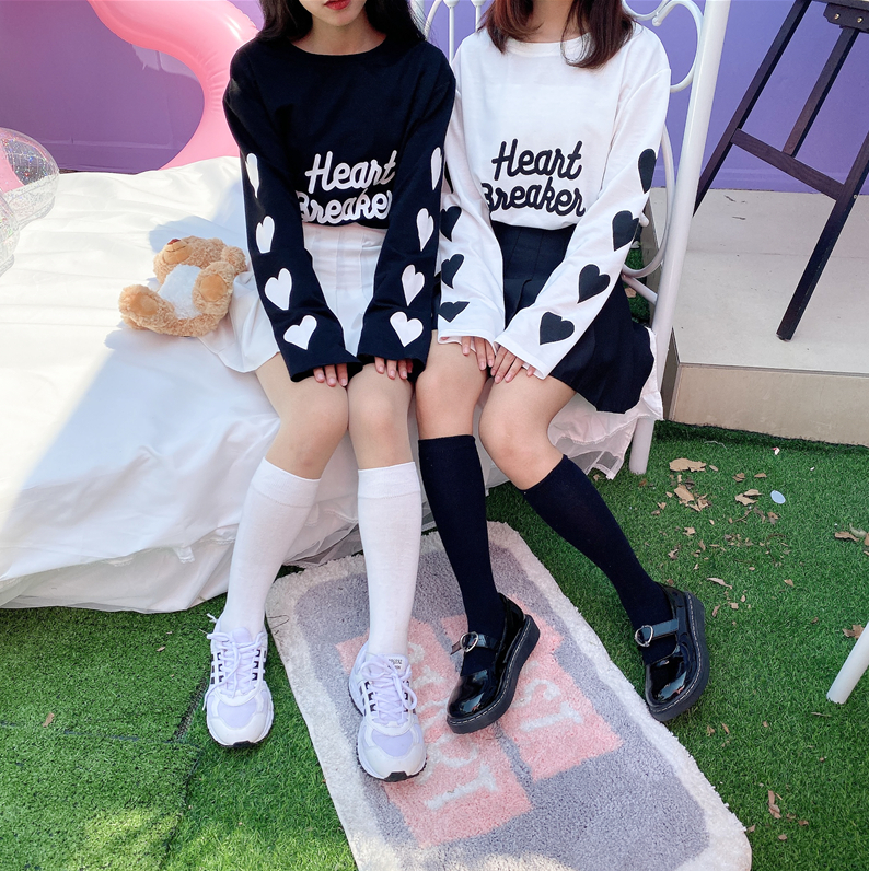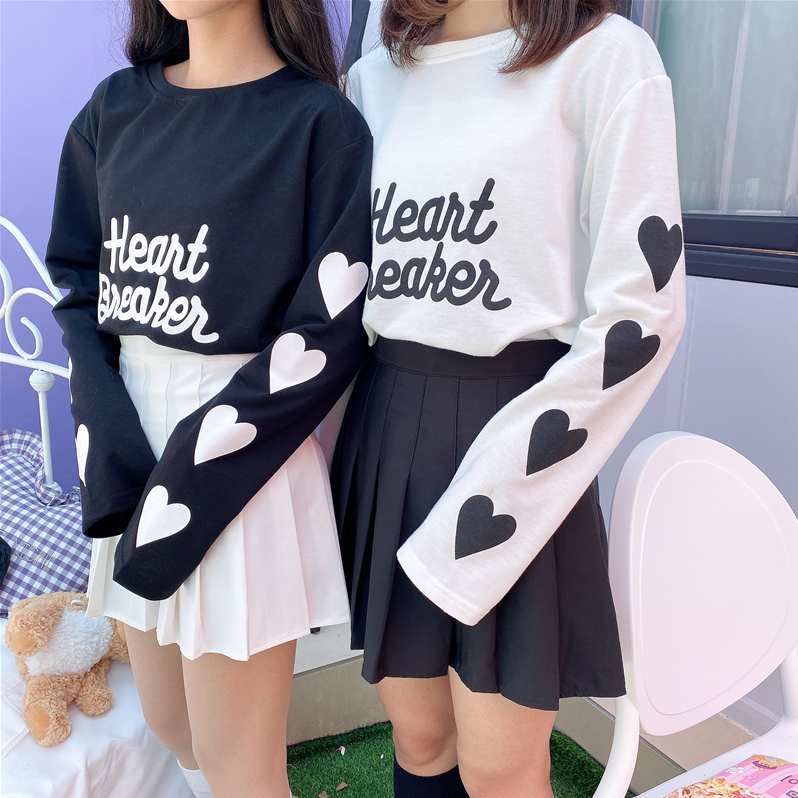 Fashion & Harajuku heart breaker printed white black color block long sleeve T-shirt.