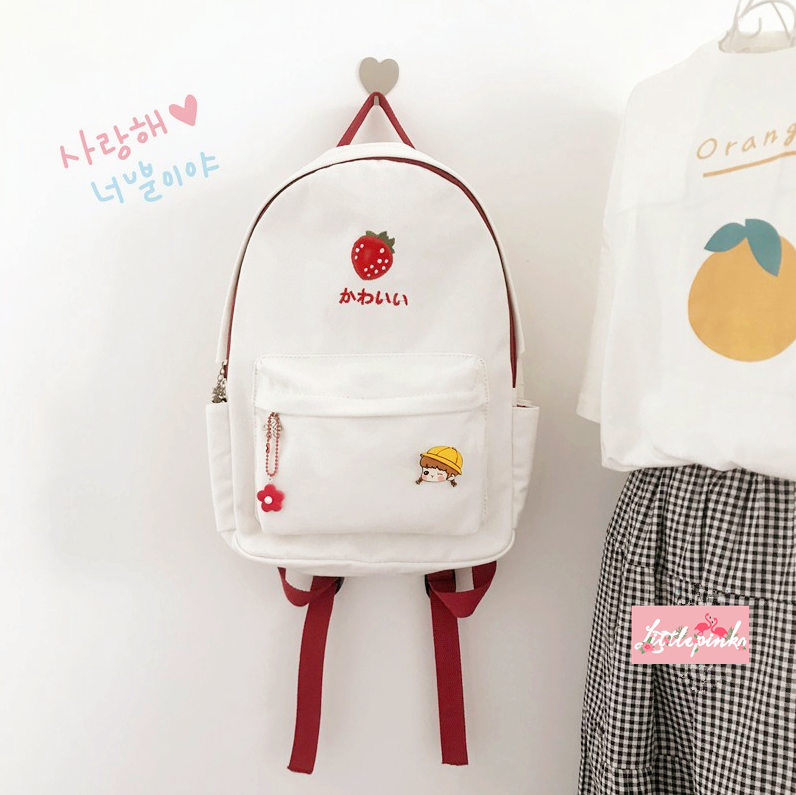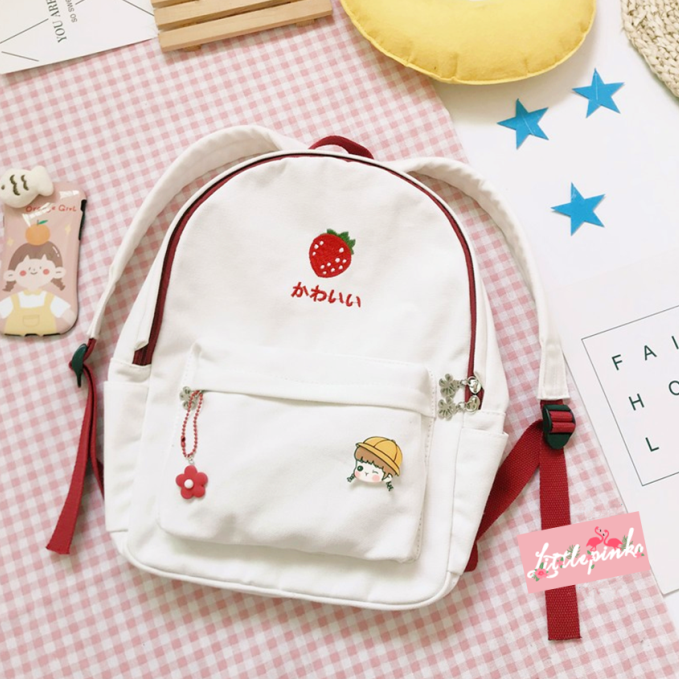 The Cute & Harajuku girl strawberry embroidery flower canvas backpack is perfect for school, work, shopping, daily life and party ect.