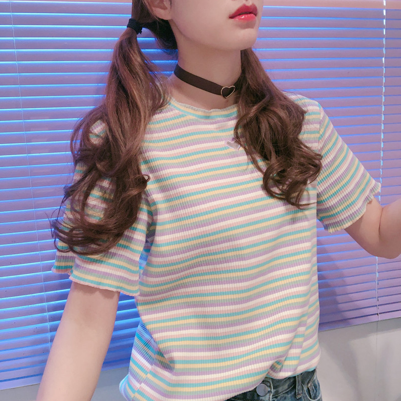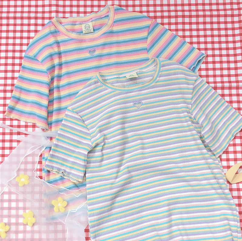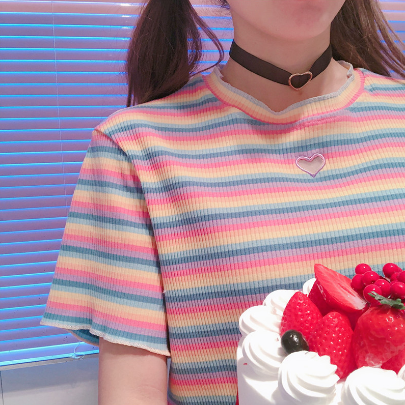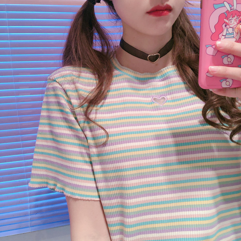 Harajuku hollow out love heart rainbow stripe short sleeve tee.