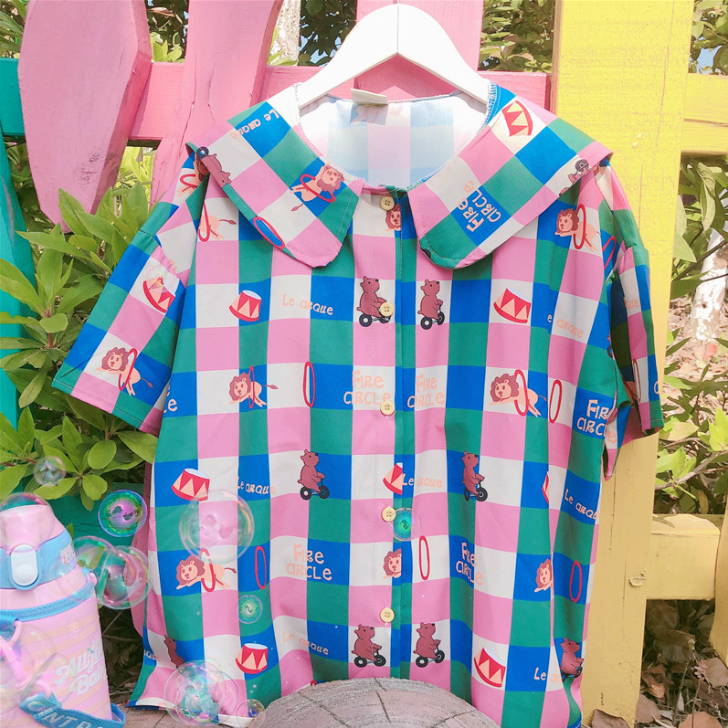 Cute Cartoon Circus Print Color Block Checker Short Sleeve Blouse Shirt