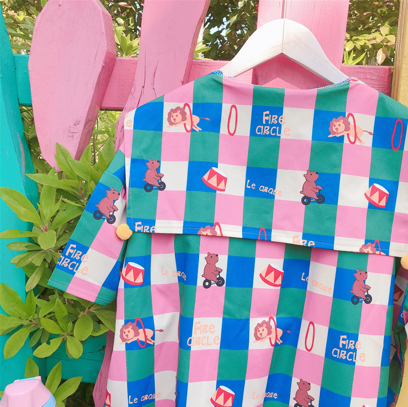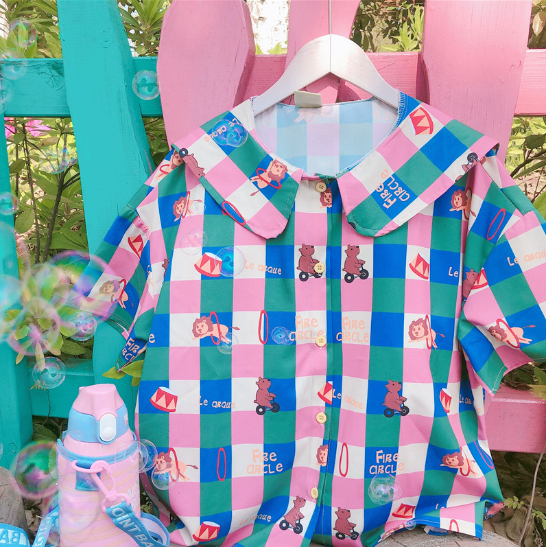 Cute & Kawaii cartoon circus print color block checker short sleeve blouse shirt.