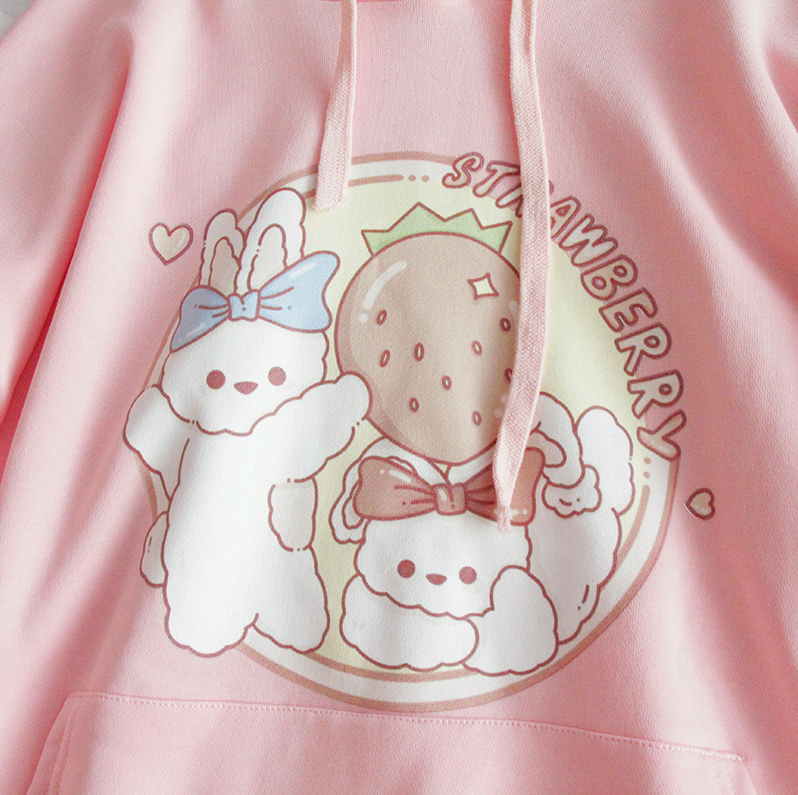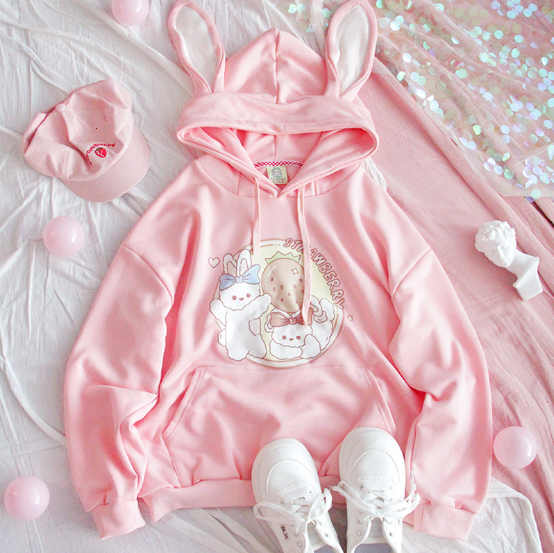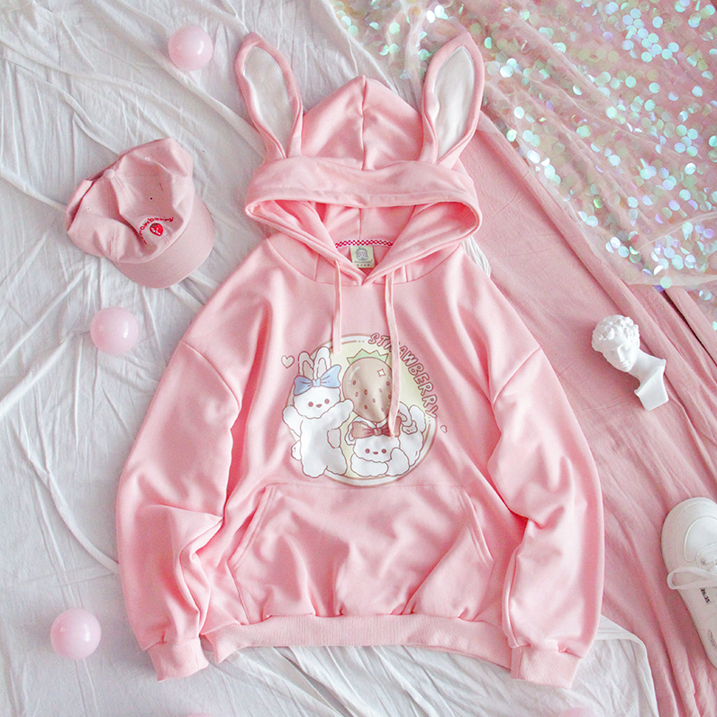Sweet & Harajuku strawberry printed pastel pink bunny ears hoodie sweatshirt.