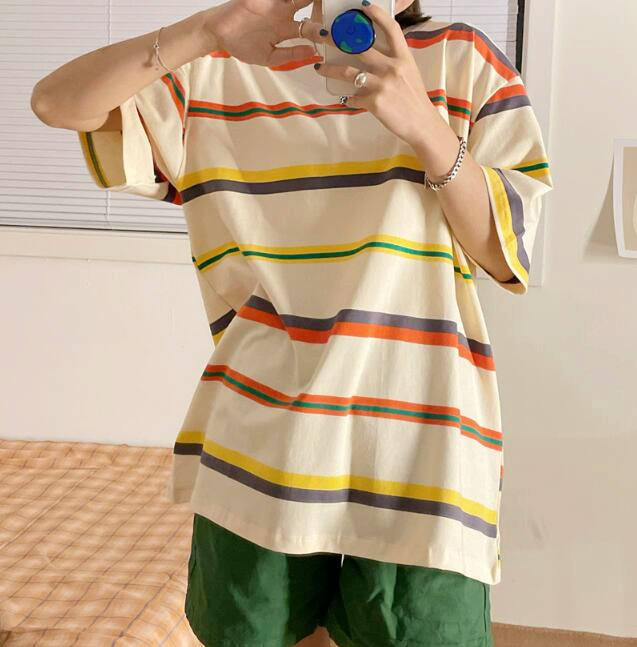 Fashion & Casual color block stripes short sleeve t-shirt.