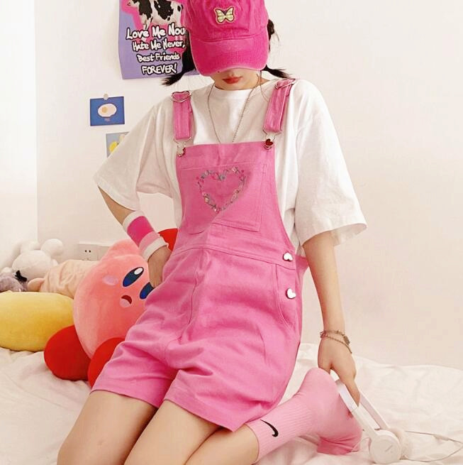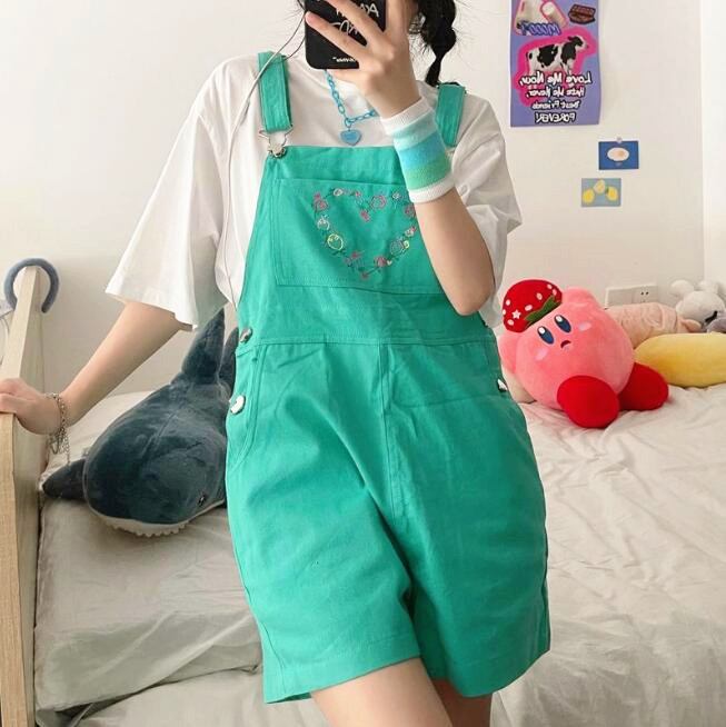 Harajuku & Fashion flower heart dungaree suspender shorts.