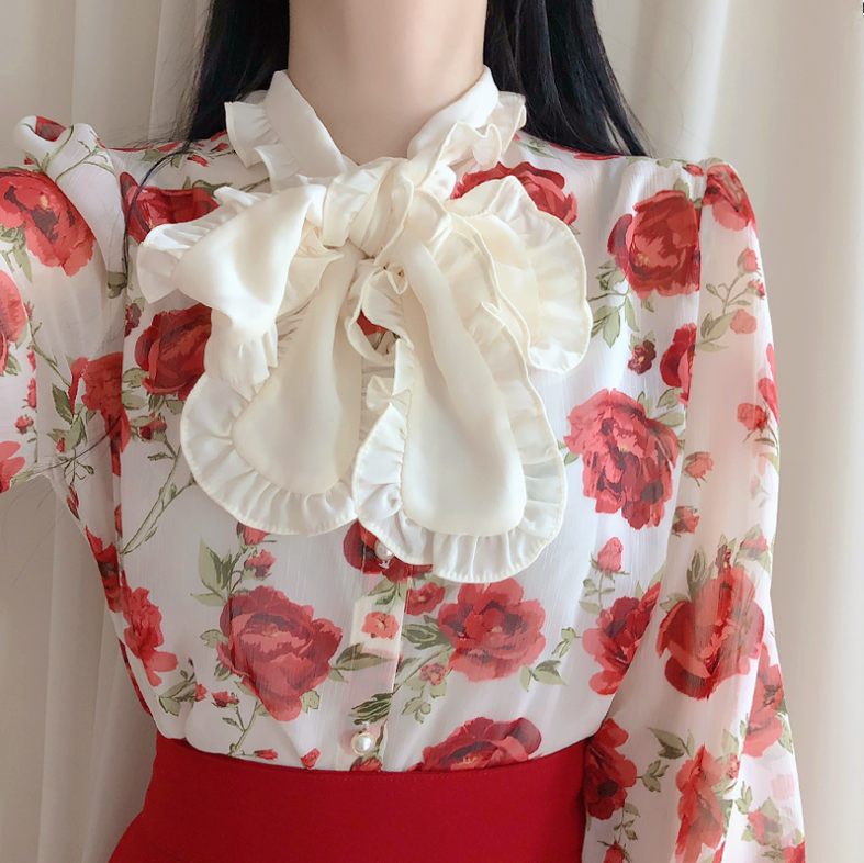 Fashion & Chic bowknot floral flower long sleeve blouse shirt for women.