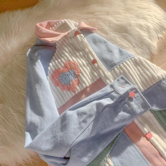 Pastel Color Love Heart Embroidery Patchwork Long Sleeve Shirt Jacket