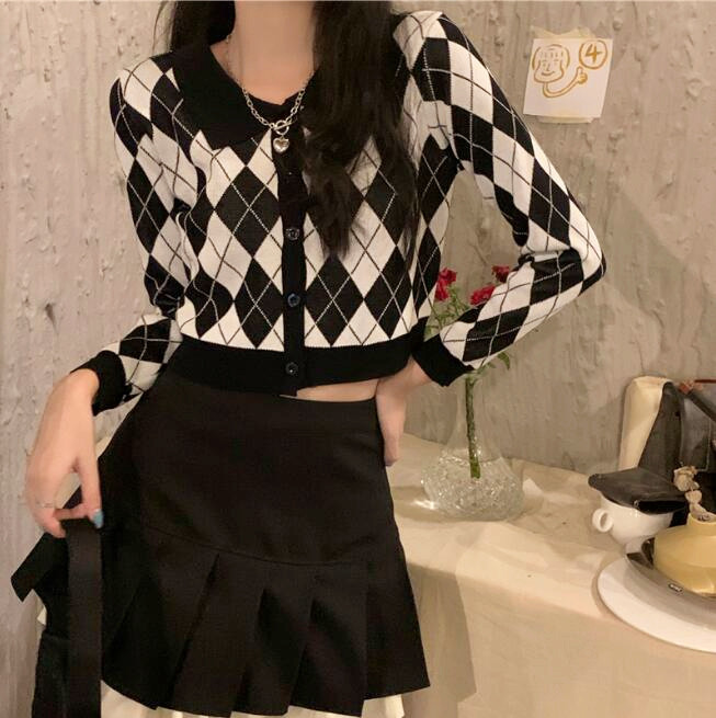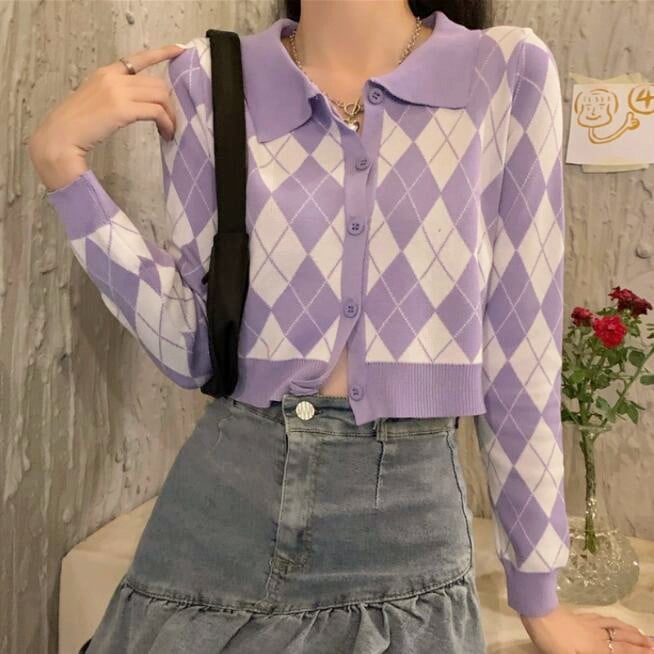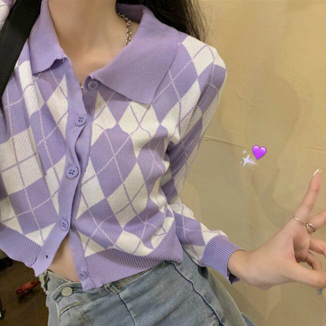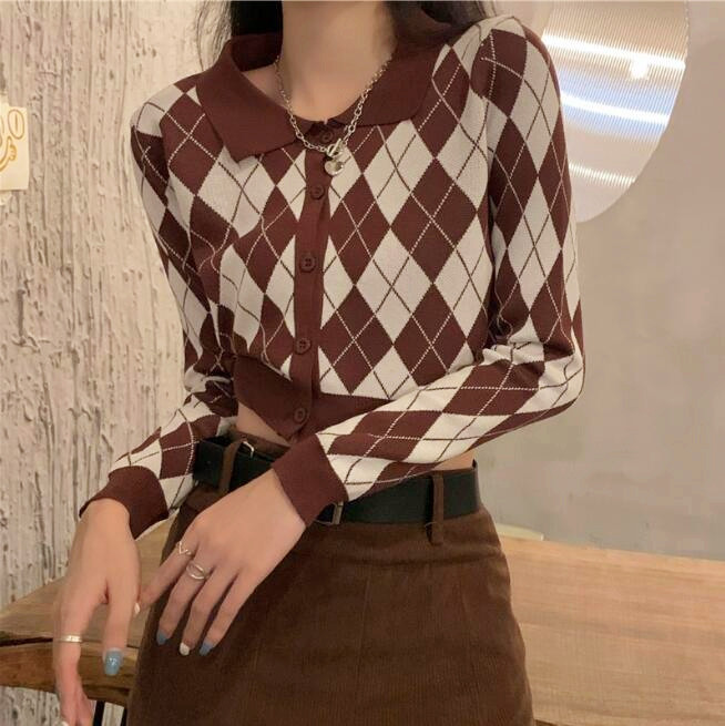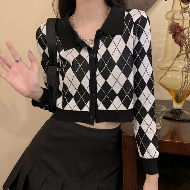 Fashion & Chic color block diamond checks knitted polo shirt cardigan.