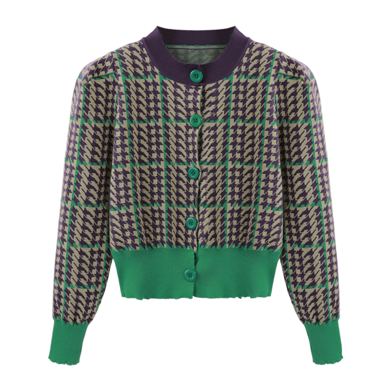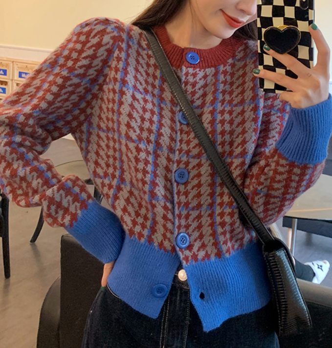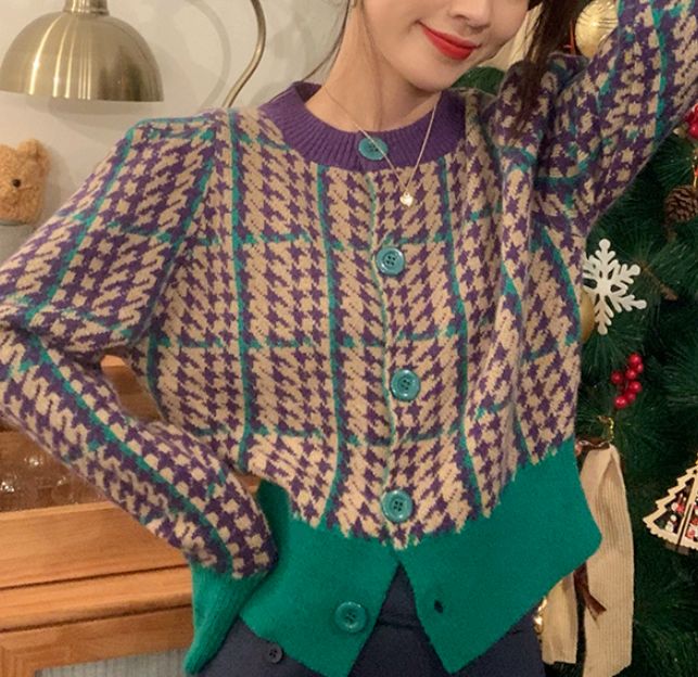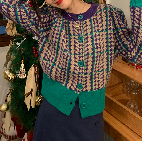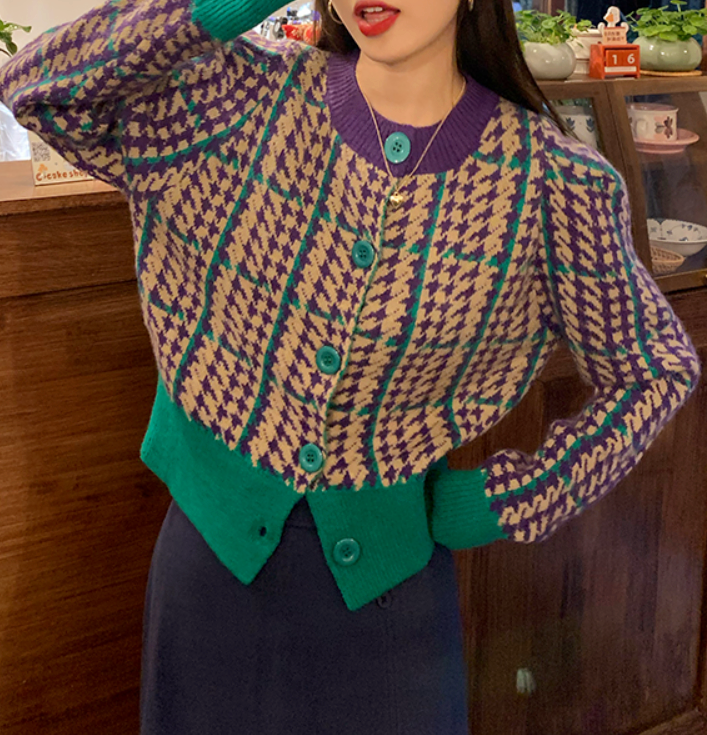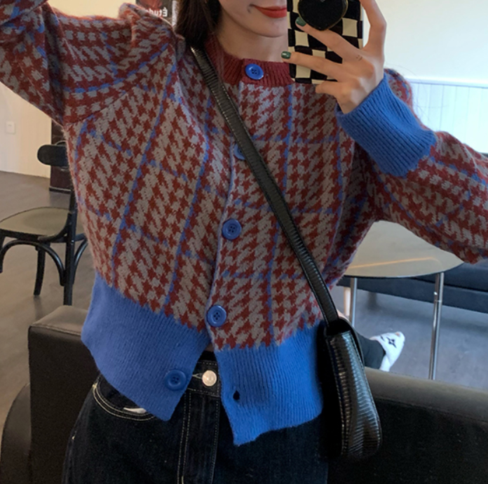 Grid Plaid Houndstooth Color Block Knitted Cardigan
