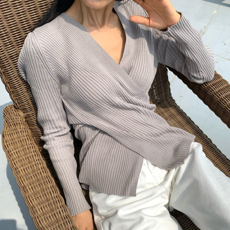 Soft & Chic V-neck cross long sleeve knit sweater.