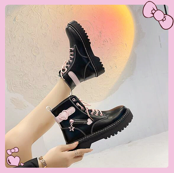 Pink Heart Buckle Star Zip High Heel Platform Lace Up Martin Boots