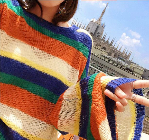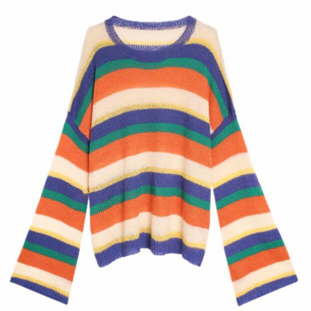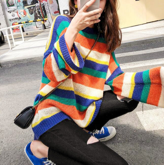 Fashion & Harajuku rainbow color block stripe pullover sweater.