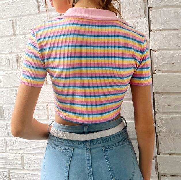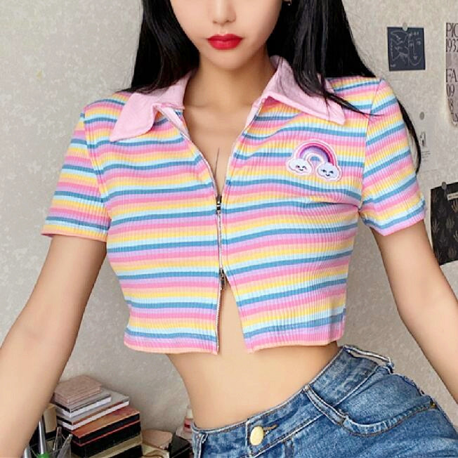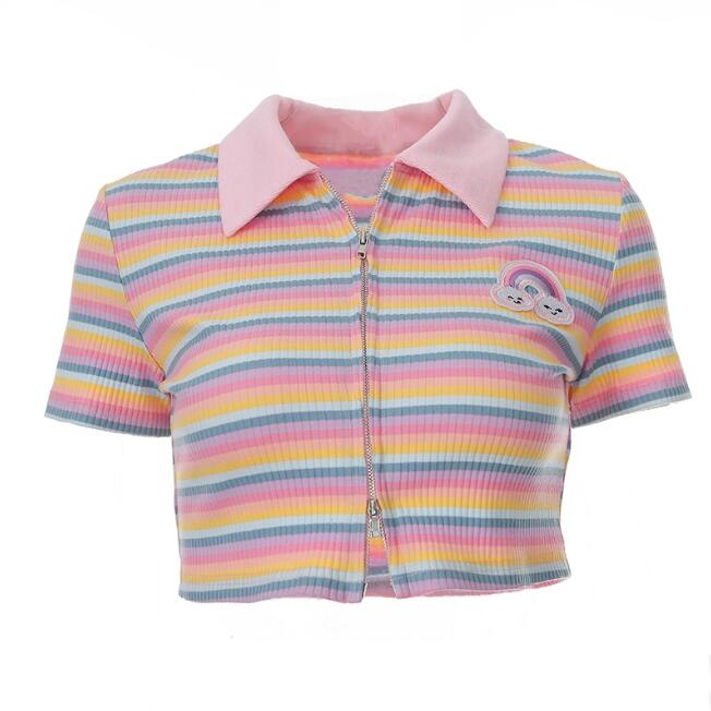 Fashion & Harajuku pastel color rainbow cloud stripe zip up short sleeve t-shirt.