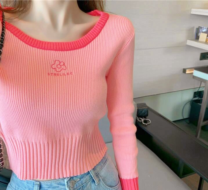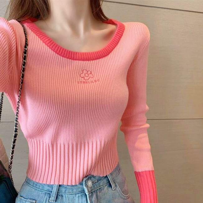 Flower Pastel Color Block Long Sleeve Pullover Knitted Top