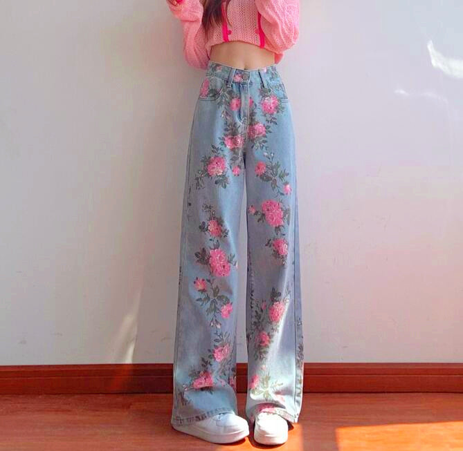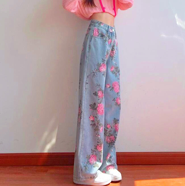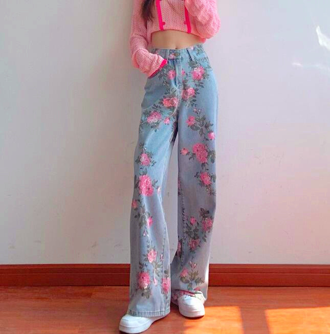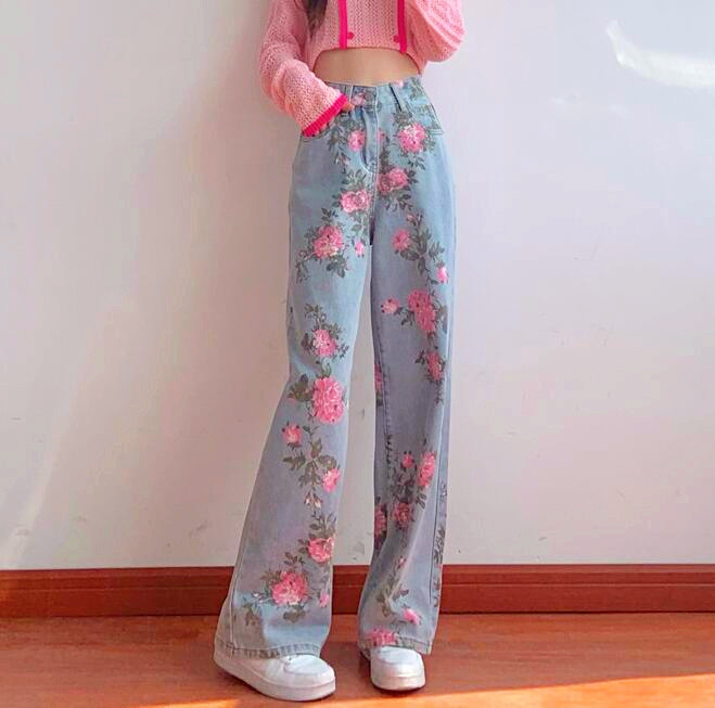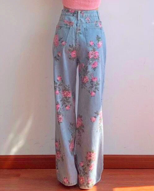 Harajuku & Fashion rose flower full print jeans denim pants trousers.