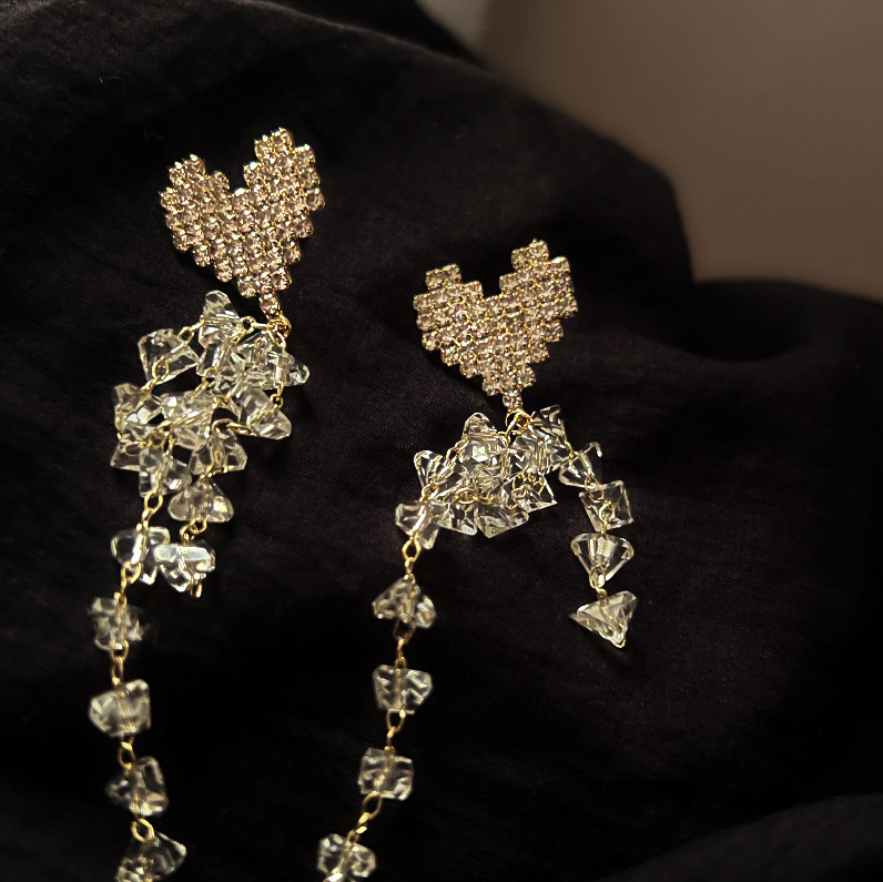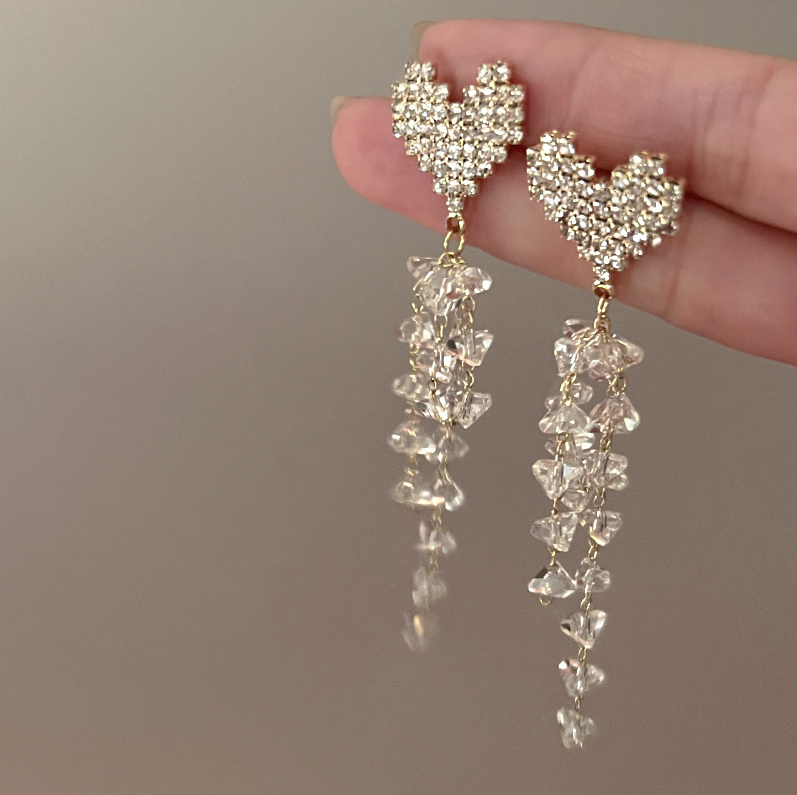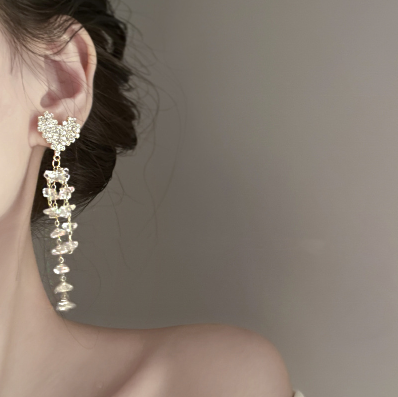 Sparkling Crystal Heart Tassel Drop Dangle Earrings