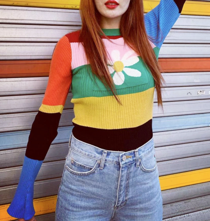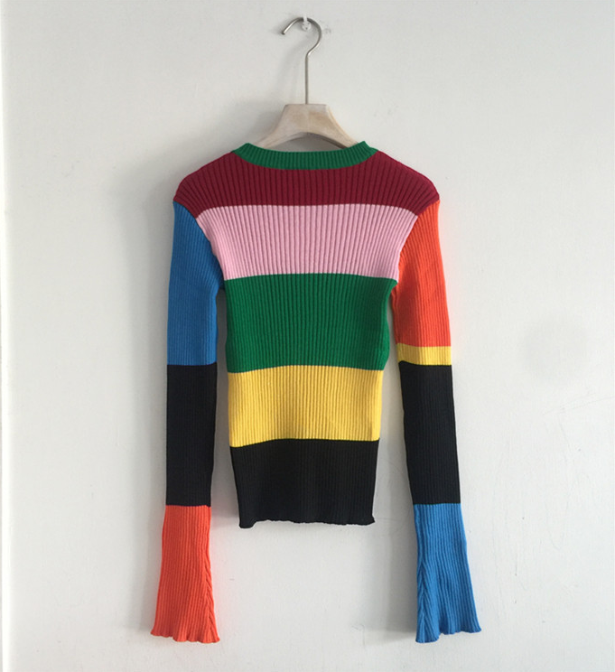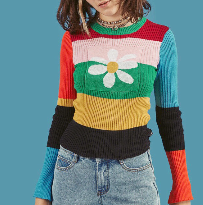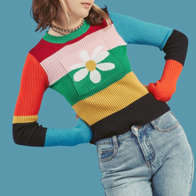 Fashion & Harajuku flower rainbow color block stripe pullover sweater.