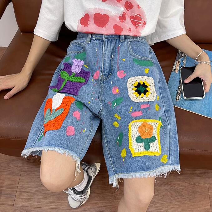 Harajuku & Fashion flower crochet jeans denim shorts.